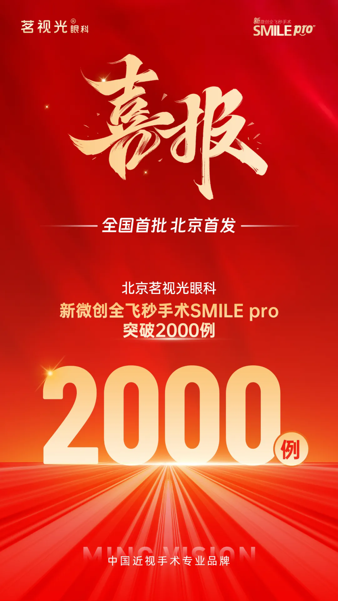 近日,北京茗视光眼科顺利完成新微创全飞秒Smile Pro手术2000例,成为全国范围内突破2000例的首批医疗机构。自今年5月10日新一代机器人全飞秒VISUMAX 800装机以来,北京茗视光眼科在我国屈光手术领军人物周跃华和李莹双博导的带领下再树行业里程碑,以新技术服务患者、回馈社会,帮助更多近视朋友实现对美好生活的追求。