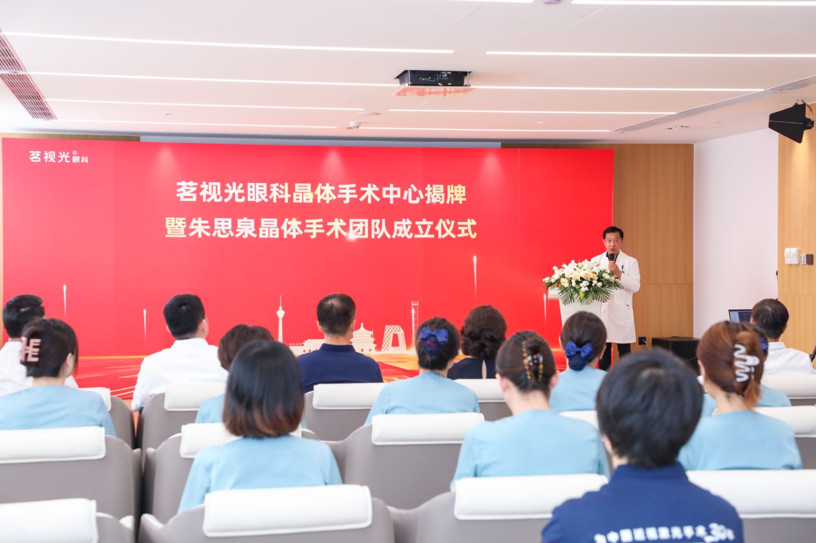 北京茗视光眼科总院长周跃华教授首先欢迎朱思泉教授正式加入茗视光,并组建晶体手术中心团队。他提到成立晶体手术中心是茗视光眼科继屈光中心、青少年近视防控中心、干眼中心后又一重要举措。他相信,晶体手术中心将在以朱思泉教授为核心的晶体手术团队成员的共同努力下,提供个性化的晶体手术技术,推动我国晶体植入和晶体置换手术技术的提升;同时,做好高度近视和白内障预防知识的普及,从源头上助力减少发病率。
