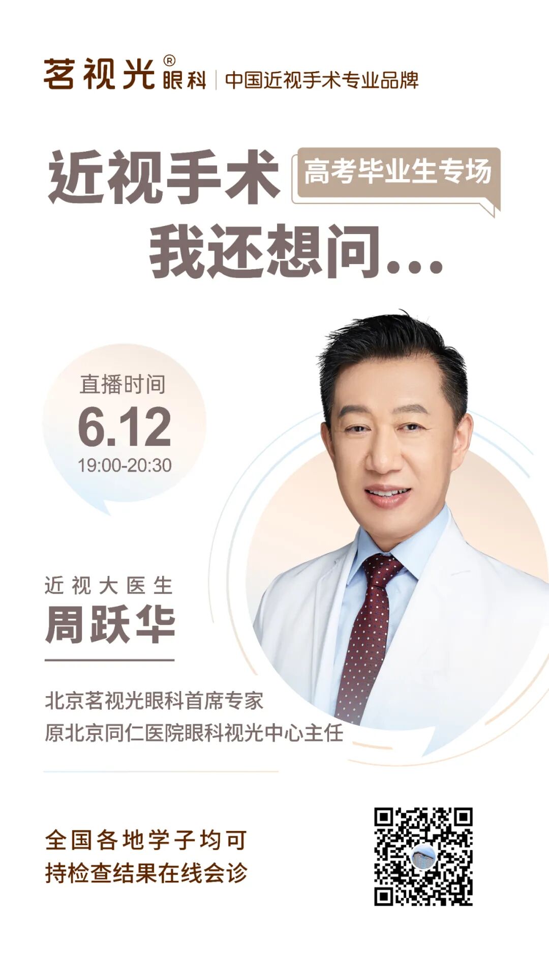 关于近视手术,如果考生和家长们仍心存困惑,请明晚锁定茗视光眼科官方视频号直播间,向周跃华教授在线提问。